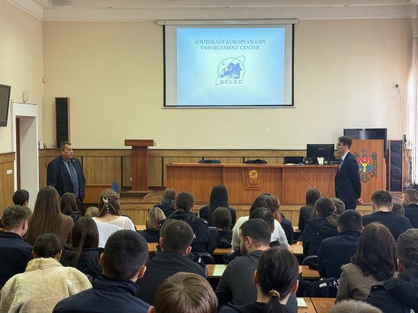 With a view of fostering recognition of SELEC among the future law enforcement officers, Mr. Georgiev, accompanied by the Police Liaison Officer posted at SELEC, Mr. Victor Harabagiu, met with the Pro-Rector of the Academy of Ministry of Interior, Mr. Iurie Odagiu, and Dean of the Faculty, Mr. Vitalie Ionascu, and addressed the cadets of the Academy, presenting the methods and forms of international law enforcement cooperation and coordination the efforts for effectively countering transborder serious and organised crime.